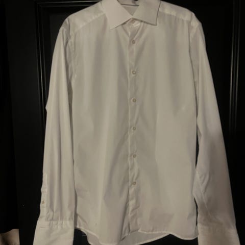 Hvit smoking/fin herreskjorte i str. 40 rundt halsen.