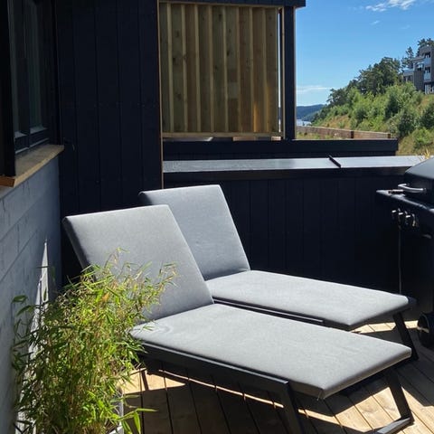 Hagestolsett med to stoler og to fotskamler i grå farge. Stolene har høy rygg og rette armlener, med puter på sete og rygg for økt sittekomfort. Fotskamlene har matchende puter og kan brukes både som fotstøtte og som ekstra sitteplass. Materialet er aluminium. Noe merker og bruksskader på stolene, men ikke noe som går utover funksjonen til stolene.