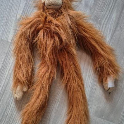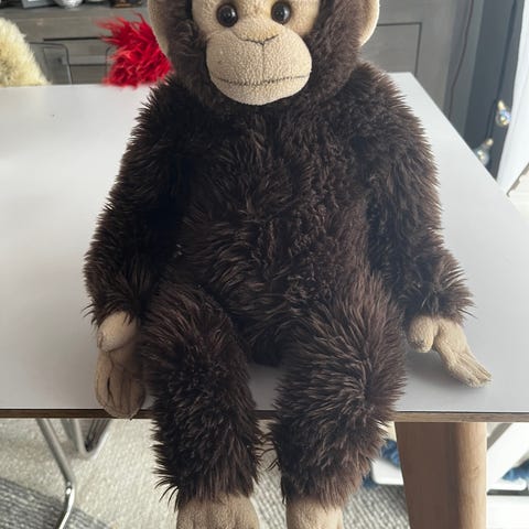 IKEA DJUNGELSKOG kosedyr-orangutang i brun farge. Mykt plysjmateriale med broderte øyne og lyse detaljer i ansiktet. Lange armer og ben, med myke hender og føtter. Passer som kosedyr for barn eller som pynt på barnerom. Ca 60 cm lang. Har borrelås på hender og føtter, slik at den kan henge.