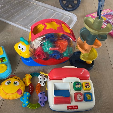 Diverse baby leker blandet pakke med ulike aktivitetsleker og småfigurer. Pakken inneholder blant annet et aktivitetsstativ, rattpanel, speilleke, rangler, stable- og gripeelementer, samt flere små plastleker i ulike former og farger. Lekene er laget i plast og er egnet for små barn som liker fargerike og enkle aktivitetsleker. Dette er en samling med forskjellige typer leker som kan brukes til variert lek og enkel motorisk trening. Litt forskjellige merker. Selges samlet til høystbydende. Må hentes.