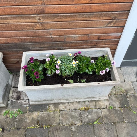 Svart blomsterkasse. Litt bruksmerker inni, men synes ikke med blomster i. Lengde: 55 Bredde: 20 Høyde: 70