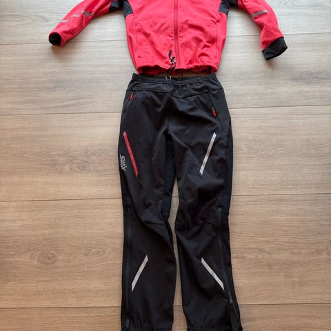 Swix skidress bestående av jakke og bukse. Jakken er blå med svarte felt, hel glidelås foran, høy krage og Swix-logo på brystet. Buksen er svart med Swix-logo på låret, glidelås nederst ved bena og strikk nederst ved anklene. Passer til langrenn eller annen utendørs aktivitet i kjøligere vær.