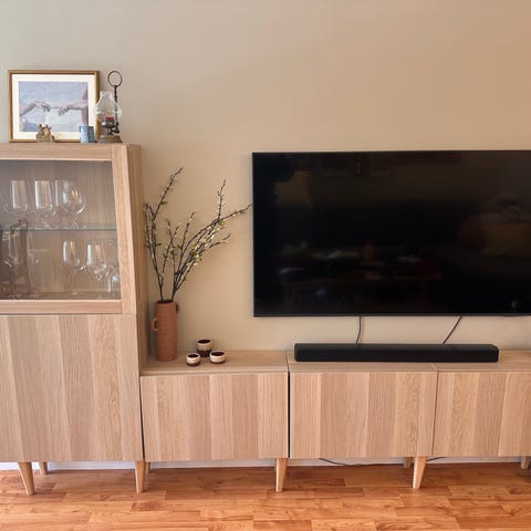 Pent brukt vitrineskap/ skjenk med svart glass topplate.