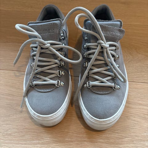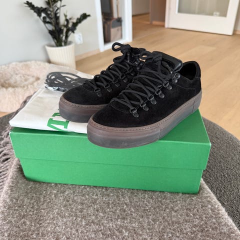Helt nye. Diemme Marostica Low Black Suede Platform W sneakers i størrelse 36. Modellen har svart overdel med snøring og metallhemper. Skoene har mørk gummisåle og kommer med ekstra lisser i esken. Store i størrelsen. Kan passe str 37.