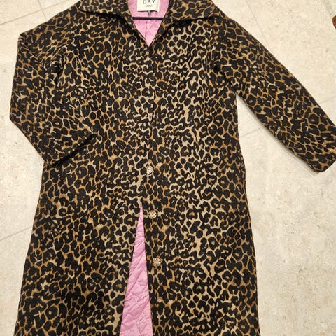 DAY Birger et Mikkelsen kåpe for dame i størrelse 36. Kåpen er beige med mørkt blomstermønster og har belte i livet. Materialet er 100 % bomull i ytterstoffet. Modellen har lange ermer og rekker omtrent til over kneet, avhengig av høyde. Passer som lett ytterjakke i overgangssesonger. Vaskes på 30 grader ifølge vaskeanvisning, kan strykes på lav varme og renses profesjonelt om ønskelig.