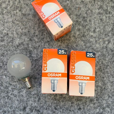 Selger 7stk gamle Osram 25W lyspærer med gul farge. De er testet og alle lyser. De kommer i original bokser. Fint i landhandel el.