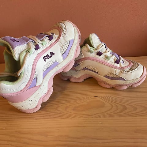 Fila joggesko for jente i størrelse 31. Skoene er hvite med rosa, lyseblå og gule detaljer.
