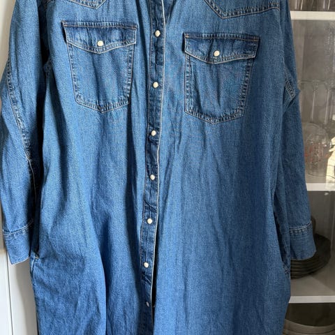 Zizzi skjorte i blå denim i Zizzistørrelse XL ( tilsvarer 52/54) for dame. Skjorten har krage, knappelukking foran og er laget i denim-materiale. Ermene er omtrent 3/4-lange med oppbrettkant. Ermene er vide.