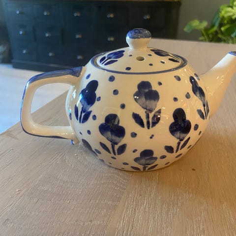 Stilig gammelt sett med tekanne og fløtemugge. Hvit med blått motiv.