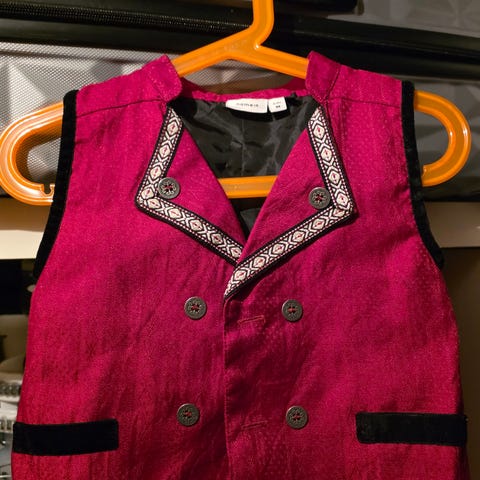 Vesten er litt ødelagt, se eget bilde (bilde nr 3). Kan settes en søm der for å feste det, ellers så syns det egentlig ikke så godt, jeg har ikke lagt merke til det før jeg skulle legge den ut for salg her.