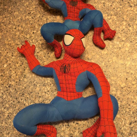 Spiderman actionfigur i rød og blå farge. Figuren er laget i plast og har klassisk Spiderman-drakt med maske, draktmønster og logo på brystet. Størrelsen fremgår av bildene med målebånd ved siden av figuren. Egnet som leke eller samlefigur for barn som liker superhelter.