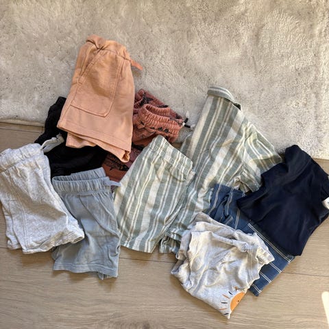 Pakke med babyklær i størrelse 62. Inneholder flere bodyer og overdeler i ulike farger og fasonger, samt noen jakker/genserer. Klærne er beregnet for baby og passer til hverdagsbruk.