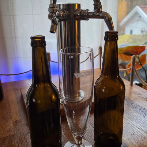 Har en flaskefyller for å fylle på 4 flasker av gangen. Har vært helt genial i vår bryggegjeng. Har også ett flasketre.