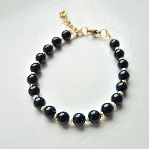 Nytt, håndlagd armbånd av kvarts og båndagat (sorte perler). Gullforgylt smykkelås og anheng av god kvalitet. Allergivennlig. Størrelse på perlene er ca. 6 mm (båndagat) og 8 mm (kvarts).