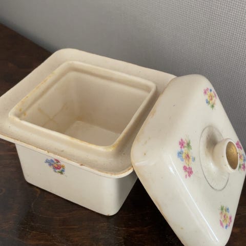 Hel og pen margarinkrukke fra Stavangerflint selges. Ingen skår eller nag, noe misfarging på innsiden av krukken (langs topp) samt underside av lokk. Gullkanten er hel, men litt redusert på noen hjørnene. Se bilder.