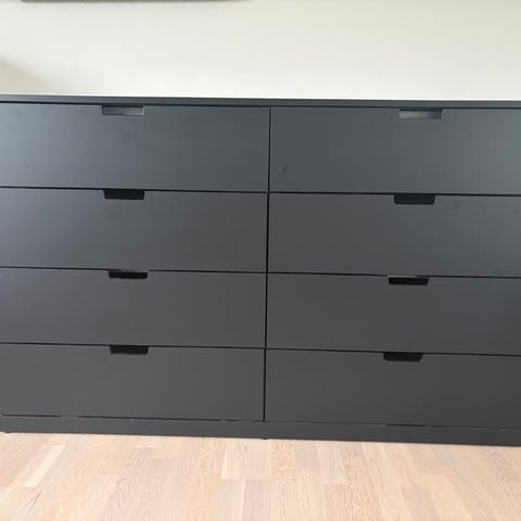Vi selger en svart kommode i forbindelse med flytting. Kommoden har fire skuffer og er ikke synlig brukt.