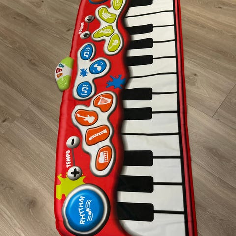 Paw Patrol elektronisk pianomatte leke i flerfarget design med motiver av figurene fra serien. Matten har store tangenter merket med tonehøyder (do, re, mi osv.) som barnet kan trå på for å spille lyder og enheter for styring av lyd på den røde kontrollenheten. Egnet som aktivitetsleke for barn som liker musikk og Paw Patrol-tema.