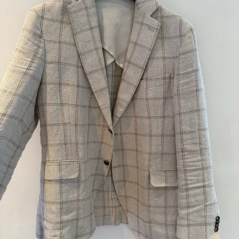 Oscar Jacobson blazer for herre i størrelse L. Blazeren er blå med rutemønster og er laget av bomull. Den har klassisk jakkeslag, knappelukking foran og flere lommer, både utvendig og innvendig. Passer til bruk sammen med dressbukse eller chinos i formelle og semi-formelle sammenhenger.