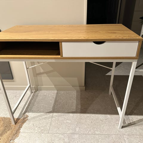 Frittstående-skrivebordet har både en fin forside og en fin "bakside". Det betyr at det kan brukes fra begge sider. Det kan stå inntil en vegg som ett tradisjonelt skrivebor, men det kan også stå fritt i rommet og ut på gulvet. Skoffer og skap er i god stand.