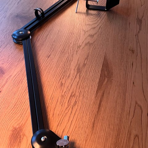 Justerbar mikrofonarm med bordfeste i svart metall. Armen har fjærbelastede ledd for enkel posisjonering av mikrofonen. Festes til bordkant med skruklemme. Øverst på armen er det standard gjengefeste for montering av mikrofonholder/krybbe/shock-mount.Egnet for bruk på skrivebord, hjemmestudio, podkastoppsett eller lignende der man ønsker fleksibel plassering av mikrofon.