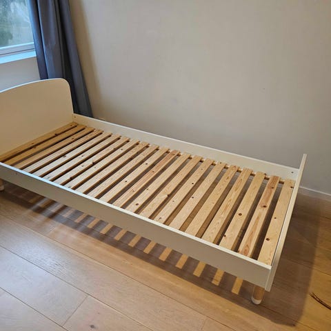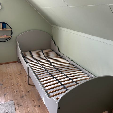 Grå Flexa Dots seng med sengehest. Fin seng til barn i tre. Knirker litt. Må hentes
