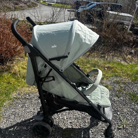Joie barnevogn i grå tekstil med sort understell. Vognen har fire hjul, justerbart sete med seler og stor kalesje. Håndtaket har trekk i skinnimitasjon. Under setet er det en oppbevaringskurv. Egnet som sittevogn til barn som kan sitte selv.