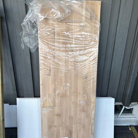 Selger 2 stk benkeplater i heltre eik som ble demontert fra kjøkken 9. mars 2026, og har vært oppbevart utendørs siden da. Vi tror de i sin tid er kjøpt på IKEA. Dybden er 60,5 cm (vanlig kjøkken benkedybde). Tykkelsen er ca 3,8 cm. Lengdene er 145 cm og 67 cm (den lengste på bildet er solgt).