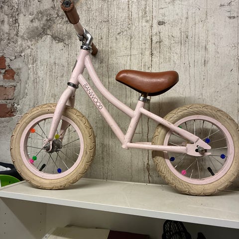 Balansesykkel med 12" dekk. Både sete og styre kan justeres. Noen små merker i lakken, men i meget god stand.