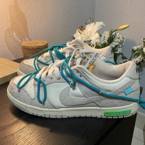 Nike sneakers joggesko i størrelse 43. Modellen har overlær i lyst beige skinn og semsket skinn med perforerte detaljer i tåpartiet. Skoene har klassisk snøring med hvite lisser og dekorative metall-detaljer foran. Yttersålen er i gummi med lys turkis farge og profilert mønster for grep. Nike-logo på side og hæl. Egnet som fritids- og hverdagssko.