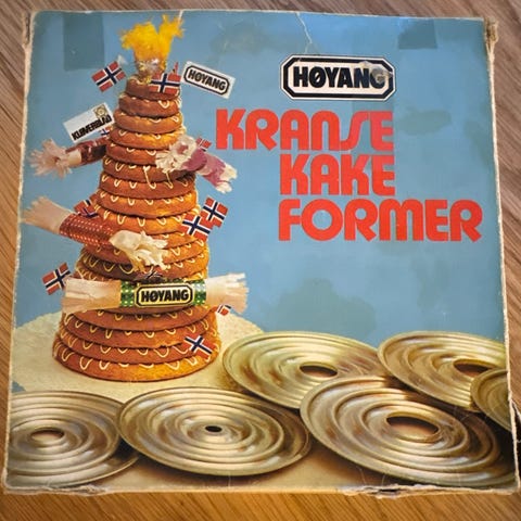 Høyang 18 ringers kransekakeformer i metall. Som nye. Sett med runde former i ulike størrelser til baking av kransekake. Formene legges oppå hverandre for å bygge tradisjonell kransekake. Til bruk i vanlig stekeovn. Produktet er merket «Macaroon mould» og «Kransekage forme» fra Høyang of Norway / Høyang Polaris. Sendes mot porto.