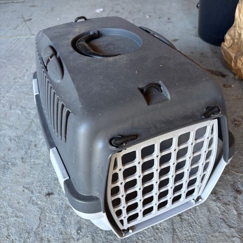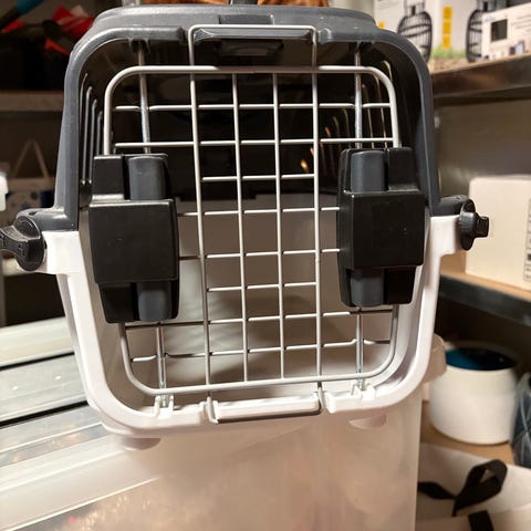 Transportbur til katt eller liten hund i plast. Buret har overdel og underdel som festes med klips, samt nettingdør i metall foran. Det har bærehåndtak på toppen for enkel forflytning. Egnet til transport av mindre kjæledyr i bil eller som midlertidig oppbevaring hjemme eller hos veterinær.