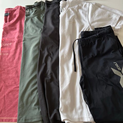 Klespakke med treningsklær til dame, str. M. Pakken består av 7 t-skjorter, 1 genser og 4 tights.