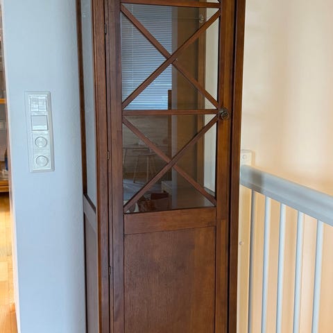 Flott vitrineskap AMADEUS, ca 12 år, kjøpt på Møbelringen Bryne. 2 hylleplater i glass. Låsbare dører. Sidestykkene demonteres for enklere transport.