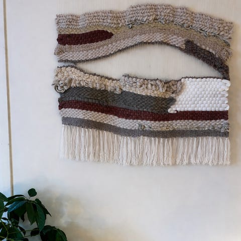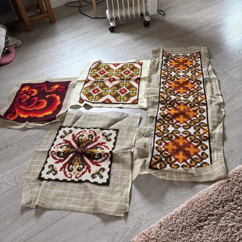2 veggtepper med figur- og dyremotiv i ull, i flere mindre formater. Teppene har vevd motiv av blant annet menneskefigur og fugl i varme fargetoner som rødt, gult, brunt og oransje på lys bunn. Hvert teppe har frynser i kortsidene og er egnet som veggpynt eller små gulvtepper i for eksempel stue, gang eller barnerom. Ullmaterialet gir et robust og slitesterkt tekstil med tydelig struktur i veven.