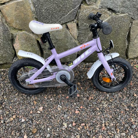 Barnesykkel 12" i lilla farge. Sykkelen har små hjul som passer for mindre barn som skal lære å sykle. Egnet til bruk på asfalt og jevnt underlag. Sete og styre kan som regel justeres noe i høyden for å tilpasses barnet. Sykkelen på bildene inkluderer både en tråsykkel og en løpesykkelvariant med samme hjulstørrelse.