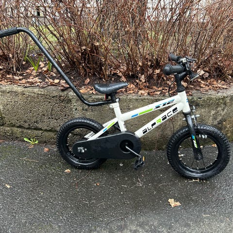 Lett og fin første sykkel. Støttehåndtak og støttehjul følger med. En del bruksmerker.