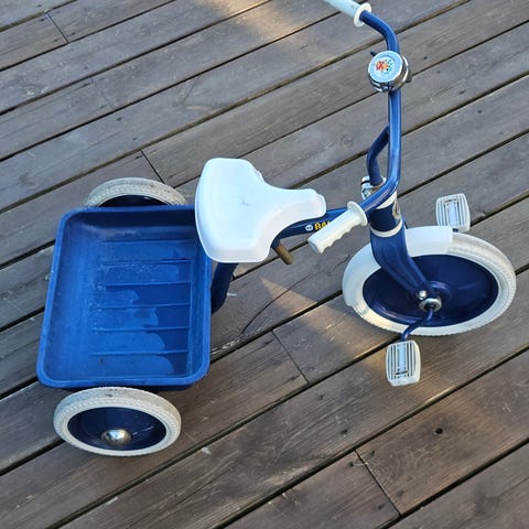 Sykkelen er stabil med tre hjul og har også et lite lasteplan bak hvor barnet kan ha med leker eller andre ting på tur. Mykt og komfortabelt sete.