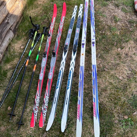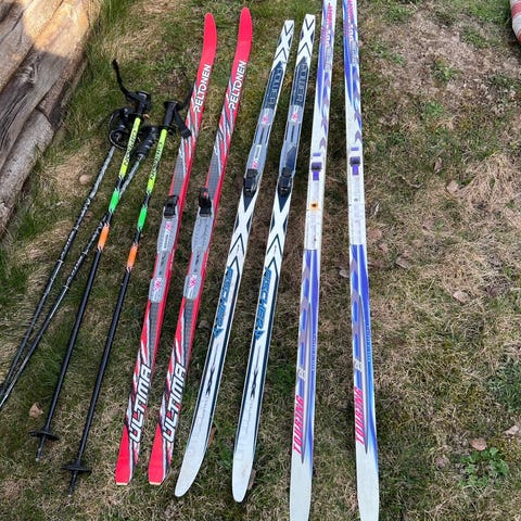 Pakke med flere par langrennsski og staver.