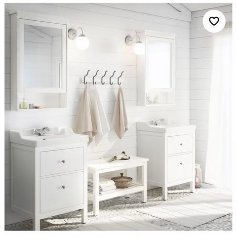 IKEA HEMNES benk på 83 cm i hvit utførelse. Benken har en solid bordplate og en praktisk hylle under med spiler for oppbevaring. Egnet for bad eller andre rom der det er behov for sitteplass kombinert med oppbevaringsmulighet.