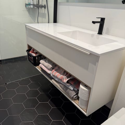 Baderomsinnredning med servant og underskap svart/hvit
