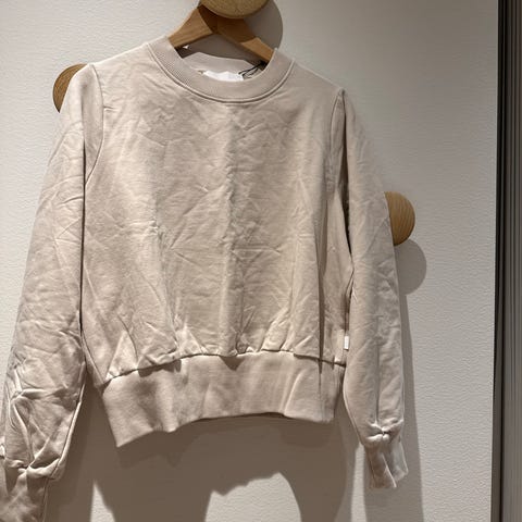 Bik Bok collegegenser for dame i størrelse M. Genseren er hvit og laget hovedsakelig av bomull, med rund hals og kort passform, perfekt til jeans. Passer til hverdagsbruk og kan kombineres med både joggebukse og skjørt.