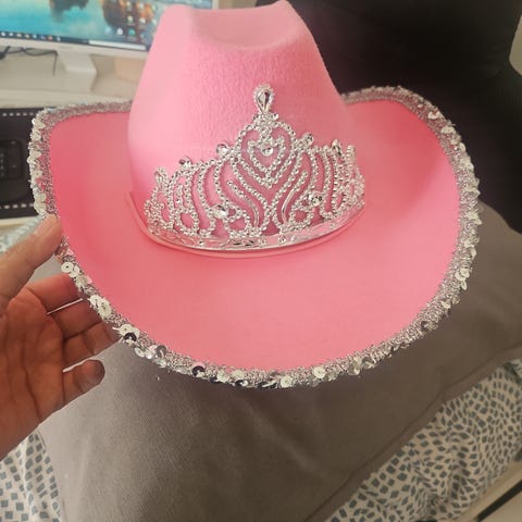 Cowboyhatter for dame i to ulike varianter. Én hatt er rosa med tekst på bremmen, og én hatt er oransje med paljetter og dekorative sømmer. Passer til utkledning, temafester eller andre anledninger der man ønsker et cowboyinspirert tilbehør. Materiale er ikke oppgitt. 50 pr styk