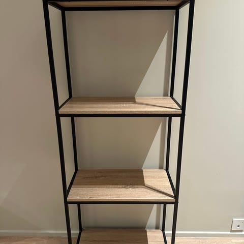 Selger to stilrene hyller fra Bohus i industriell stil (sort metall og eikefarget tre).