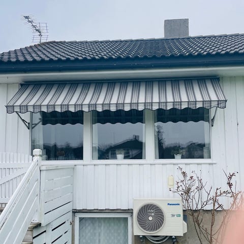 Markise til vindu med kassett og duk. Markisen er montert over et tofløyet vindu og dekker hele vindusbredden. Den har duk med mønster og en kassett som beskytter duken når markisen er trukket inn. Egner seg for montering over vindu på fasade for å skjerme mot sol og innsyn.