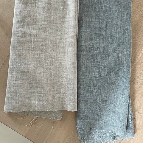 Stoffet er isblått melert med sjatteringer. God tyngde og fin vevet. Kjøpt på Green Apple . Utspris er ca 6-700,- pr m selges kr190,- for hele.