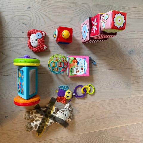 Forskjellige rangler, aktivitetsleker, kosedyr, biteleker og oppheng til vogn/babygym.