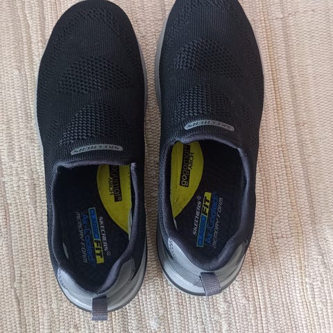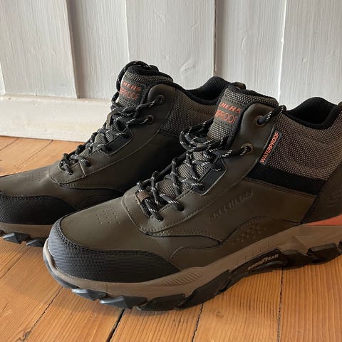 Skechers Sport tur sko slip-on i størrelse 43. Skoene er i beige farge med overdel i tekstil/imitert skinn og robust yttersåle med grovt mønster tilpasset fottur og lett terreng. Modellen er uten lisser, med hemper foran og bak for enklere av- og påtaking. Innvendig tekstilfôr og polstret kant rundt ankelen gir ekstra komfort ved bruk på tur og til hverdags.(semskede sko)