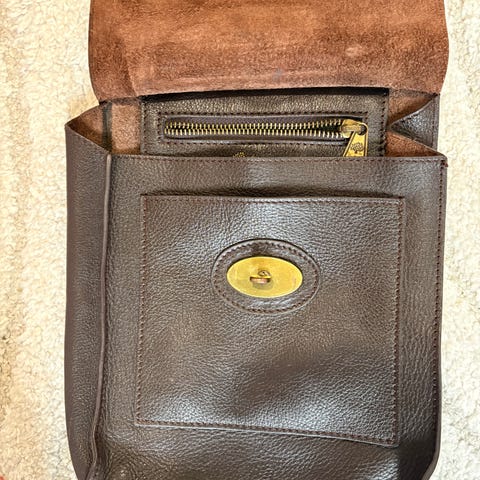 Mulberry skulderveske for dame i brunt lær med preget krokodillemønster. Vesken har justerbar skulderrem og klaff med spenne-lukking. Innvendig er den foret med rutete tekstilfôr og har et hovedrom. Metall-detaljer i gullfarge med Mulberry-merke på siden. Egnet til hverdagsbruk til å bære mindre nødvendigheter som lommebok, mobil og nøkler.