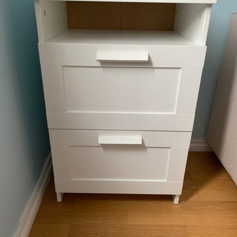 Pent brukt liten kommode med to skuffer. Stabil og praktisk, passer godt som nattbord eller liten oppbevaringskommode.