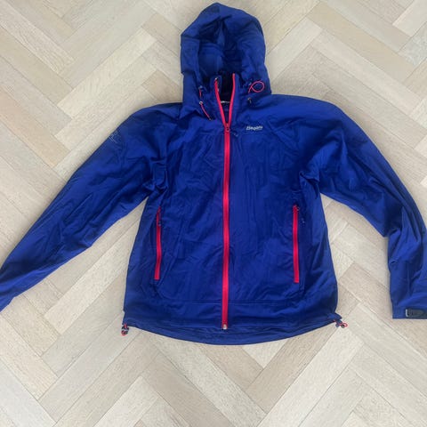 Jakke er i blå polyester med hette. Jakken har mesh-fôr i deler av innsiden for bedre ventilasjon.
